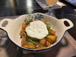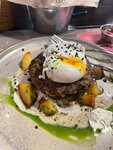 Грандбиф с жареным картофелем, яйцом пашот и соусом блю чиз
