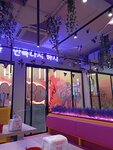 Очень атмосферное место. Красивый интерьер. Есть фото будка для мгновенных фото, игровые автоматы с игрушками. Еда вкусная, не острая. Хотя в меню есть и острые позиции для любителей. Брали рамён с говядиной и сырный, и корндоги. Корндоги особенно понравились - хрустящие, много сыра, вкусные соусы. Есть термопот с бесплатным горячим зелёным чаем и бульоном. Также очень понравился бабл ти с Орео. Вдобавок, возле кассы можно купить разные снеки вроде соевого мяса. За 20 руб в чеке дают в подарок одну к-поп карточку, неожиданно приятно.