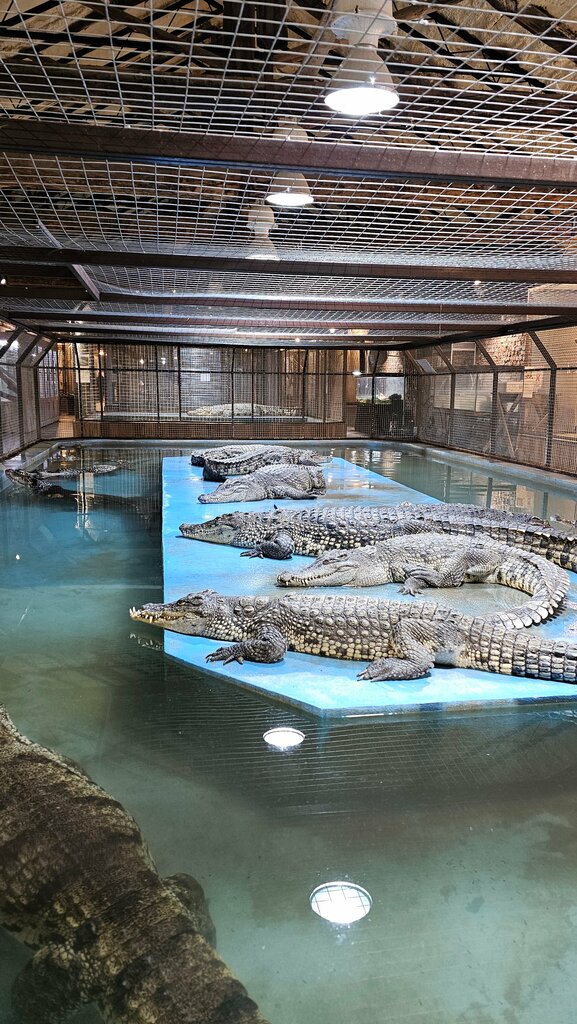 Сразу скажу, там есть две зоны. Первая - уличная, и что приятно - вход туда бесплатный. Там прямо настоящая деревенская идиллия: гуси, утки, хрюшки бегают, козочки. Есть даже страусы! Но главные «директора» этой территории - кошки. Их там очень много, гуляют везде с важным видом, чувствуют себя полноправными хозяевами, очень мило выглядит. Корм для всей этой живности можно купить на месте в магазинчике (стоит недорого, стаканчик овощей/корма - от 50-100 рублей), дети обычно в восторге от кормежки. ​Вторая часть это уже само здание с экзотикой, вход туда платный. По ценам сейчас уже точно не напишу, но скажу что цены средние. На что то и высокие даже. Помимо огромного количества крокодилов, там целый зоопарк. Мы видели шимпанзе, каракала (красавец с кисточками на ушах!), кучу разных ящериц типа гекконов. ​Отдельная тема - это еда. У них свое кафе, где можно попробовать настоящую экзотику. Фишка заведения - улитки! (они их сами выращивают). За кафе есть улиточная ферма, туда водят экскурсии за отдельную плату (билет стоит в районе 200-300 рублей). В меню есть классика, например, вкусный плов или борщ, но мы приезжаем ради необычного. Можно заказать блюда из крокодила! Есть что то из улиток и их икры (брр) ​В общем, место отличное: и погулять, и зверей покормить, и деликатесов поесть. Рекомендую!