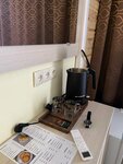 Отель в целом неплохой. Номер на 4-м этаже, лифта нет, в номере чисто, чистое и свежее постельное бельё и полотенца, есть тапочки. В ванной одноразовые гель ,шампунь , зубная щетка и паста. Вода горячая есть круглосуточно. В номере мини-холодильник , чайник, кружки и ложки, пакетиков с чаем нет.Вода должна быть в кулере на 3-м этаже, но он не работал. В 5-ти минутах ходьбы есть Пятерочка и КБ, воду там покупали. Утюг один на всех на 2 этаже. В кафе не ходили. До центра пешком минут 30-35.