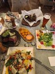 Были на мероприятии в этом ресторане. В салате из рукколы и морепродуктов, вкусные королевские креветки, но практически нет ни масла, ни соуса - сухая руккола. Аналогичная ситуация с рыбой и мясом. Подали рыбу гриль, шашлык, креветки в кляре и никакого соуса, совсем... Картофель по-деревенски оказался таким же одиноким), без какого либо смазывающего эффекта. Единственное, где на столе был хоть какой-то соус - это соус на основе хрена к мясной нарезке и всё. Я не думаю, что здесь ошибка заказчика мероприятия, как правило к любому мясному или рыбному блюду подаётся хоть какой-то соус. Иначе просто сухомяточка. Приготовлены рыба и мясо вкусно, но отсутствие изюминки впечатление испортило.