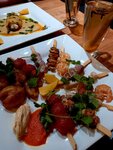 Брали Мидии в соусе том ям и шашлычки из морепродуктов, всё очень понравилось, вкусно, порции большие. Очень вежливые официанты и быстрое обслуживание.