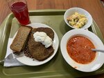 Еда посредственная столовская (есть можно, но вкусной особо не назовëшь), обстановка казëнная, но при этом ценники неадекватно задраны. К примеру, обед с первым, вторым, салатом, компотом и булочкой обошлось в 770 рублей. В районе есть столовки и кафе, где можно поесть повкусней за более вменяемую цену и в более приятной обстановке.