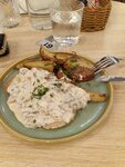 Уже были в кафе этой сети, но на Пятницкой улице. Тут с ребенком оказались рядом со станцией метро Смоленская и решили пообедать в этой кафешке. Здесь интерьер понравился больше, больше места, очень уютно. По меню все также большой выбор блюд в будние дни до 16.00 по 250 рублей. Заказ по куар коду, оплата безнал. Взяли медальоны из свинины с картофелем под сливочно грибным соусом, запечённые роллы сливочный лосось, круассаны с красной рыбой, салат с утиной грудкой и милкшейк ребенку, а себе бесплатный чайник чёрного чая. Очень все было вкусно и бюджетно. Была пятница, час дня, но ажиотажа не наблюдалось, много свободных столиков. Ждать нам не пришлось. Официанты внимательные, вежливые, блюда принесли быстро. Вышли очень довольные. Будем продолжать тестировать кафе этой сети.