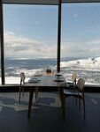 В первую очередь - это расположение, которое позволяет в зависимости от времени года, от погоды наслаждаться потрясающими и такими разными видами. Интерьер полностью соответствует внешнему виду - стекло, бетон, минимализм. И все это смотрится вполне естественно на фоне гор. Даже летом стоит позаботиться о бронировании столика. Зал не такой большой, а желающих - много.  Правда, стоит отметить, что при таком потоке посетителей всю имеющуюся площадь не заставили столами вплотную. Сидеть очень комфортно. К тому же есть возможность подойти к витражам сделать фото, не мешая сидящим рядом. Проблем с обслуживанием точно не ощутил. Общение в вежливой форме, все вовремя - подача меню, блюда. Читая меню, хочется попробовать всё. Банального нет. Даже самое простое из меню блюдо удивляет необычным сочетанием вкусов. Кухня - на высочайшем уровне. Даже не буду пытаться описать вкус, аромат, текстуру блюд. Не буду пытаться подобрать эпитеты. Просто все очень вкусно. Чек вышел явно больше, чем в др ресторанах Кировска, но полностью оправдан.