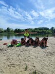 Небольшой уютный песочный пляж. Песок привозной, вход в воду удобный. На берегу натянута сетка для игры в волейбол. На другом берегу на острове - станица Елизаветинская.
