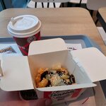 Свежий ремонт и вежливый и расторопный персонал это плюс. Но, ребята, что с едой! Совершенно бесвкусная курица, картошка,кофе. Весь вкус только за счет соусов и вкусовых добавок, которые очень сильно соленые. И вид просто жуткий. Например стрипсы по гавайски. Как это на картинке и в реальности. 12 маленьких кусочков панировки . Курицы там просто мизер. Где то на дне коробочки. В общем резюмирую. Цена- качество явно друг другу не соответсвуют. Надо что то срочно делать. Я лично больше в ростикс не ногой.