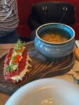 Честно, не вкусно. Самый не впечатляющий ресторан из основных в городе, при позиционировании, как супер гастро место. Луковый суп еще ничего, правда слишком соленый, но ничем не отличается от французского лукового супа, непонятно, что в нем особенно должно было подчеркнуть местное происхождение из села Лух. Бифштекс абсолютно блеклый, пытаешься его в соус макнуть, так от соуса четыре ягодки, размазанные по краям. Короче, ничего не захотелось доедать. Десерт еще брала - вообще не запомнился, ни подачи какой-то, ни особенного вкуса. Единственное, что интересно - безалкогольный алкоголь. Официант порекомендовал коктейль, но я так и не распознала в нем вкус того самого б/а алкоголя, так что не знаю, как на вкус именно этот ингредиент.