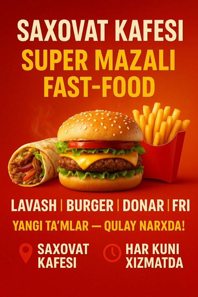 Saxovat Kafe” — 24/7 ishlaydigan, keng menyuga ega va har bir mijozni mamnun qilishni maqsad qilgan qulay ovqatlanish maskani. Bizning fast food taomlarimiz va shirinliklarimiz, Chiz burger 28 000 so‘mdan boshlanadi, narx sifatga mos, hamyonbop va...