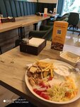 Были втроём в субботу днём. На улице идёт ремонт соседнего здания, так что обходить пришлось дворами. Брали три вида шаурмы: острую (мужу понравилась), арабскую и турецкую – они не впечатлили, показались на вкус довольно пресными и обычными. Из плюсов – приятно хрустящий лаваш, а также комфортный диаметр шаурмы, которая легко помещается в рот. На десерт взяли пахлаву, она на сахаре, а не на меду, в целом ок, но не впечатлила. Интерьер приятный, туалет довольно чистый. У всех столов есть по 2 розетки, довольно удобные кресла и диваны. Не уверена, что приду сюда ещё раз, но в целом место нормальное, просто на районе есть шаурма повкуснее в той же ценовой категории.