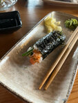 В ресторане очень приятная атмосфера, интересная музыка. А также, хочу отметить внимательность официантов, сразу готовы помочь с заказом. Заказывала салат Нисуаз, два вида шашлычков (с говядиной и курицей) и хосомаки лосось. За Нисуаз повару огромное спасибо! Только приготовленный, горячий, картофель хрустит, заправка пальчики оближешь! Шашлычок с курицей на пять, с говядиной суховат. Хосомаки лосось не соответствует меню. Принесли без икры, но с рисом и луком. Эти ингредиенты в меню не указаны. Было вкусно, но не соответствовало заказу.