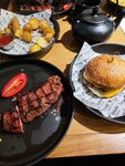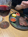 Очень понравилось заведение! За час забронировали столик, но дошли раньше, нам хостел перенесла время и посадили за столик к прекрасной Майе. Давно хотели прийти попробовать здесь стейки, дождь сыграл на руку, зарулили на ужин Брали зеленый салат, томаты со страчателлой - немного не хватает кислинки в заправке зеленого, а томатах не хватило вкуса южных томатов после отпуска ☺️ В целом, вкусно Майя посоветовала стейк миньон - мягко, прекрасно даже в остывшем состоянии - я ем медленно. Шираз отлично дополнил вкусовые эмоции и цена за бутылочку вина порадовала Муж взял стейк зернового откорма - кстати, официант просит проверить прожарку сразу - отправили на дожарку. Довели до медиум - получилось отлично - такой мужской вкусный стейк. В общем и целом, рекомендуем! Не пугайтесь очереди - столики быстро освобождаются - людей усаживают. Стейки демократичны по цене и при этом вкусные, и не отказывайте себе в удовольствии запить хорошим красным вином 👌🏻