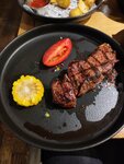 Отруб из задней части лопатки, Постный и плотный стейк с ярко выраженным мясным вкусом, Томат, Жареная кукуруза, Специи, Розмарин