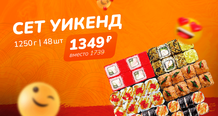 Базовый минимум — ролл. Роскошный максимум — сет роллов по прокомоду 💎 Ответ очевиден! Сет «Уикенд» весом 1,2 кг/48 шт за 1349₽ вместо 173...