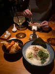 Решили зайти с коллегой вечером после работы на ужин. Из еды брали Рамен с лангустинами, Рамен Том Ям, брали по половине порции, но её оказалась более, чем достаточно,чтобы наестся ))) также гёдза с уткой, пироженные моти. Первый раз попробовали саке, уточняли у официанта какое лучше взять на наш вкус, помог с выбором 👍🏼 Атмосфера очень спокойная, располагает к беседе, приглушённый свет, ощущение и вправду, как-будто, ты попал в Японию. Место к посещению очень рекомендую!