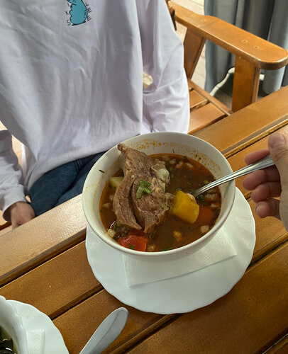 Мы сюда заходим всегда за похмельной шурпой - очень помогает, плюс зацените какой огромный кусок мяса. Другие блюда тоже вкусные, я люблю еще плов тут! А еще здесь милый летник и зеркальный потолок.