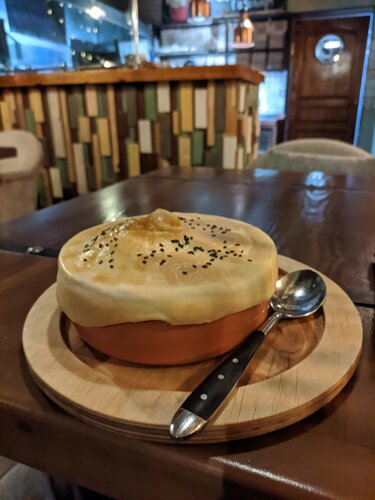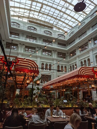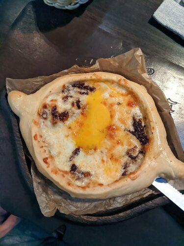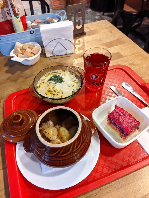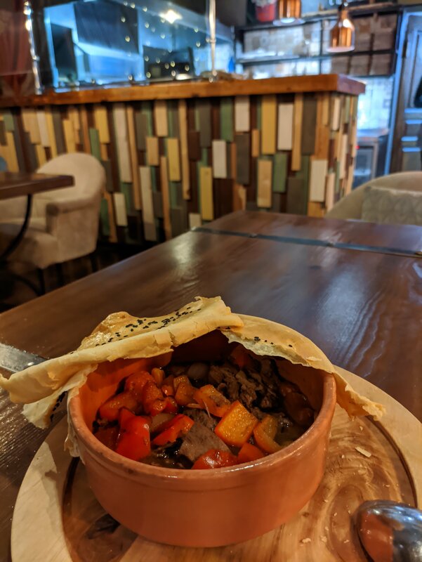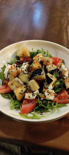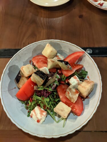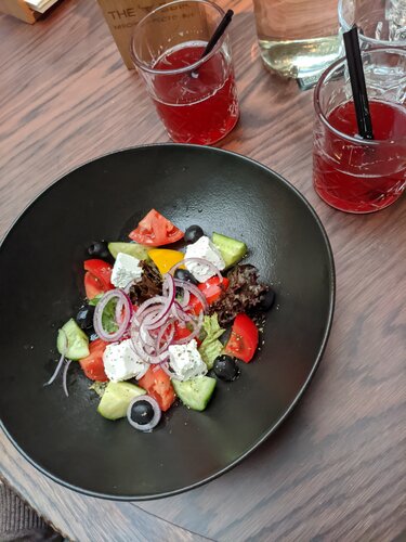 Добрый вечер, всем! Это один из моих немногих отрицательных отзывов. Долго хотел посетить данный ресторан и вот 26 октября 2025 года это случилось, очередь ждали не долго, не больше 20 минут. Однако с первых же минут было ощущение, что это ресторан ориентирован не на качество, а на количество и поток людей, которые сюда не вернутся. Столик нам попался почти у входа, и столик был весь в жирных пятнах, бутылки воды не было. Только после просьбы столик был протерт, затем подали салат "греческий"(на фото), однако тарелка была жирной, то есть от соприкосновения с ней все руки стали жирными. Далее салат заменили, но в нем были уставшие овощи (на фото). Больше терпеть было невозможно и мы с супругой ушли в Tehnikum, печально, что ориентир не на клиента. 2 звёзды только за комплементарные чизкейки
