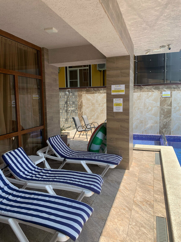Проживали в отеле с 09.06.2024-20.06.2024 и остались очень довольны отдыхом. Отель действительно небольшой, по фото было ощущение, что он побольше, но это ничего страшного) номер уютный, в ванной комнате теплый пол - это супер! Постельное белье ароматно пахнет, мне лично такое очень нравится. Жили на 1 этаже, и там у нас был мини балкончик с крутым подвесным креслом, столиком, стулом и сушилкой (супер!) изначально подумали, что будут люди ходить мимо балкона и будет шумно, но вовсе такого не было. Каждый вечер сидели на балкончике и ужинали, было очень комфортно и уютно :) Бронировали без завтраков, но оказывается, что у нас с 15.06 завтраки были включены и уже оплачены нами)) завтраки весьма неплохи, для черноморского побережья шведская линия приличная, выбор блюд нормальное. Отдельное спасибо за оладушки теплые - просто объедение!! Администратору Марие передаем привет от ребят, что раньше всех уходили на море, она всегда готова была помочь, интересовалась как проходит отдых и всегда встречала с улыбкой. Отель находится в очень удобном месте касаемо района, рядом вкусные местечки с мясом, завтраком, вином всё это рядом) Музыку выключали вокруг уже в 22:00, отдыхать было спокойно! Ближе к 20 числам кол-во отдыхающих росло, видно было начало сезона. Единственное пожелание внимательней быть к вывескам про уборку, иногда не убирались, когда висела табличка, но мы не такие привереды) Спасибо за отдых, думаю еще вернемся 🩷