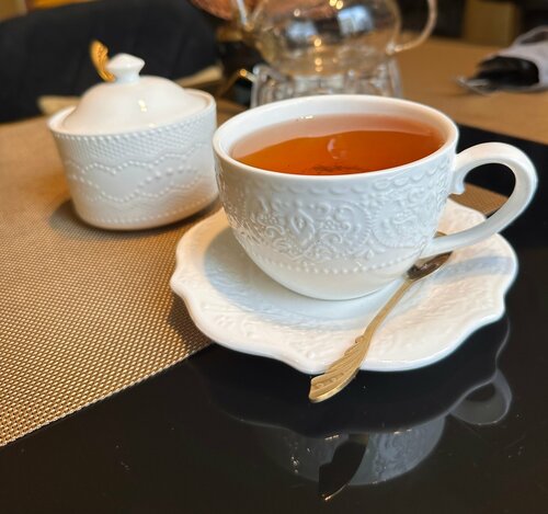 Все вкусно, салат с курицей и грушей 😋, посуда очень красивая. Продумано все до мелочей. Хороший вид из окна.