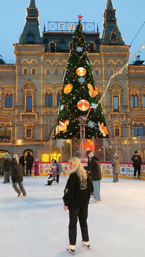 Каток хорош рано утром и в будни для богатых: 950 руб за час и 600 руб прокат. Очень много людей на катке, просто толпа, каток маленький, аки дворовый. Выходы на площадь перекрыты кордонами силовиков, проход через рамки металлоискателей с досмотром- занимает от 15 до 30 мин. Вокруг катка есть киоски, где можно купить еду, вкусно, но тоже дорого, от 300 до 650 руб за порцию чего-то там.