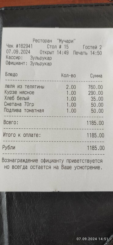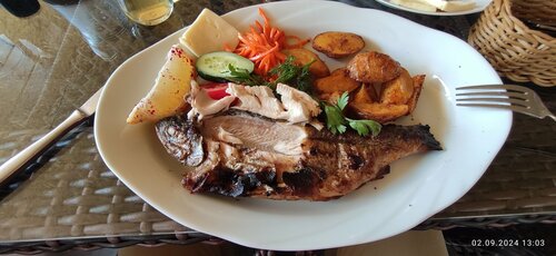 Очень вкусно, приемлемые цены. Много местных посетителей, что уже говорит о высоком качестве ресторана. Вдвоём пообедали на 1200р. Доехали с трудом, порции большие.