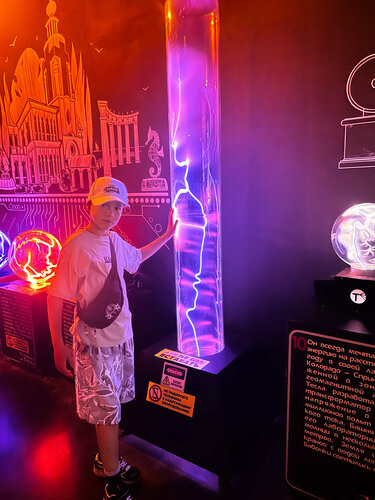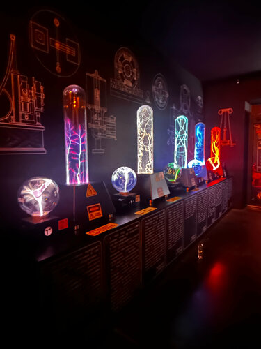 Час лекции . Небольшое помещение. Вначале показали классно отснятый ролик про Николу. Потом опыты и можно было самим создать ток и даже потрогать рукой. Через ток слушали музыку. Это реально очень громко. Поэтому с детьми малышами и беременным нельзя 100%. Модно прийти еще. Необычно