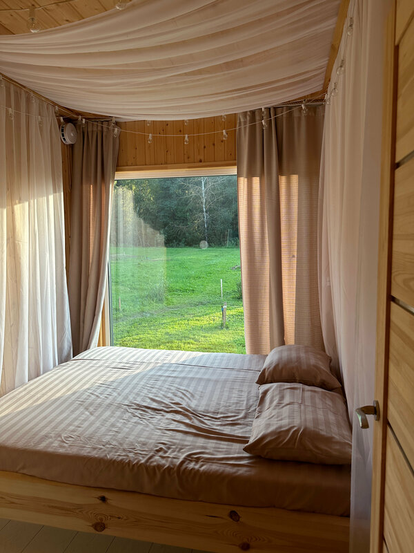 Очень классно, красивый вид из окна. Мы жили в домике бохо тут есть Алиса и проектор что очень удобно