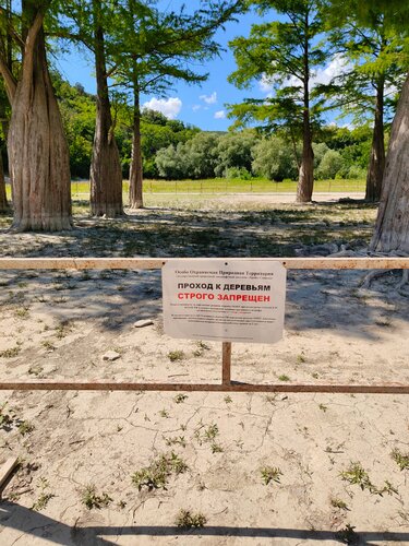 Ездили посмотреть на кипарисы в июне. Решили обойтись без организованной экскурсии, взяли такси из Анапы и через 30 минут были на месте. До самого озера можно прокатиться с ветерком на электромобильчике (50р в одну сторону). И уже оттуда идти к кипарисам, либо подплыть на катамаране (если озеро не обмелело). Озеро мутное, грязное, народ купается (хотя висит табличка запрещающая это делать) Вокруг есть кафе, туалет, различного рода развлечения, сувениры. К кипарисам мы пошли пешком по лесу (по пути есть лавочки, платные беседки) дорога комфортная, приятно прогуляться в тени деревьев. Обратно возвращались по берегу (нам и этот путь понравился😄) Вокруг красота, несмотря, на то, что озеро ну оочень сильно обмелело. Подойдя к кипарисам, увидели удивительные деревья бутылочной формы. К сожалению, из-за пересохшего озера оголенные корни возвышались над почвой. Печально😟 Хорошо, что их огородили забором и предусмотрительно повесили табличку запрещающую проход к деревьям, чтобы народ не топтал корни ради "красивых " фото. Но даже это не всех останавливает. В некоторых местах железный забор был изогнут и поломан. Неужели какая-то фотография стоит того, чтобы подвергать опасности эту живописную рощу болотных кипарисов?! Такого места в России больше нигде нет! Только здесь можно увидеть занесённые в Красную книгу болотные кипарисы.
