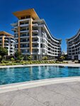 Новый аппарт отель с большой красивой территорией. На территории большое количество бассейнов, отличный аквапарк, есть кафешки, отель с отдыхающими, но места хватает всем. Отдельно бегать занимать шезлонги не надо. До моря идти не близко +-15 неторопливым шагом. Сразу за территорией находится продуктовый магазин "Мигрос" и вещевой рынок с аптекой.
