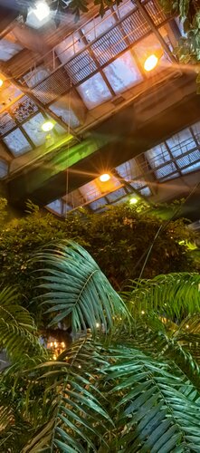 Двоякие ощущения от посещения. Были с подругой 10.01.26. Как и писали в отзывах, в самом помещении прохладно. На улице — 9. Одежду оставляешь в отдельном помещении, там она остывает, и потом совсем некомфортно её надевать) Здание старое с большими окнами, ожидаемо, что тепло не будет, поэтому я оделась теплее обычного. Мы выбрали место у стеклянной стены, которая отделяет ресторан от театра. Так вот там пахло кошачьей мочой. Самих котиков не увидела, увы. Кухня средняя. Понравилась скорость приготовления и сама подача. Брали салат с баклажанами: баклажаны в жирном толстом кляре. Но закуска из свёклы очень даже зашла. Вафли благодаря наполнителям неплохие, но сами по себе средние. Понравился горячий Чили шоколад. Необычно и вкусно. Из плюсов: приятная хостес, милый официант Анатолий. Всё приготовили быстро. Отличная задумка, но реализация подвела. Я подозреваю, что дело в старом здании, больших окнах. Видимо, сложно создать более комфортную температуру, ведь ещё нужно учитывать и запросы растений. Они выглядят вполне счастливыми)