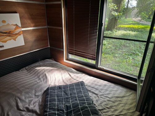 Потрясающее место, одно из лучших, где бывали. Отдыхали с 18 по 20 июля в домике №1. По порядку: закрытая территория, все удобно и близко расположено: парковка, река и пляж, баня, чан. Отдельный респект мангальной зоне: полностью под навесом, большой стол, две лавочки, удобный мангал и раковина, где можно помыть и посуду, и овощи, и руки при необходимости. Есть решетка и шампура, казан. Рядом баня. Возле дома на веранде банный чан, кресло-качель и встроенный в веранду гамак с подушками. Веранда с видом на реку. До реки 30 метров. Соседи через высокое ограждение, ощущение, что вы одни) База отдыха существует недавно, поэтому в доме все новое. В кухне-гостиной телевизор со смарт-ТВ, большой холодильник (большая редкость в глемпингах), посуда, чай, кофе и специи, если кто-то забудет). В спальне только кровать и комод. Удобный матрас, новое постельное белье. На всех окнах москитные сетки. Из гостиной открывается потрясающий вид на реку. По периметру лампочки, вечером очень красиво и уютно). Единственное -нет кондиционера, зато есть вентилятор. Ванная комната просторная, с душевой кабиной. Есть фен, зубной набор, бумага, гель/шампунь/жидкое мыло/средство для мытья посуды. Мы потрясающе отдохнули, теперь вернемся в межсезонье, хотим опробовать баню и чан. Место однозначно рекомендую.