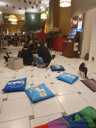 Хорошее антикафе с котиками. Животные ухоженные, в кафе чисто, запаха нет. Персонал вежливый, знают каждое животное и могут о нем рассказать. Также есть настольные игры, чай, кофе и печеньки. Можно приносить свою еду и уносить понравившегося котика домой:)
