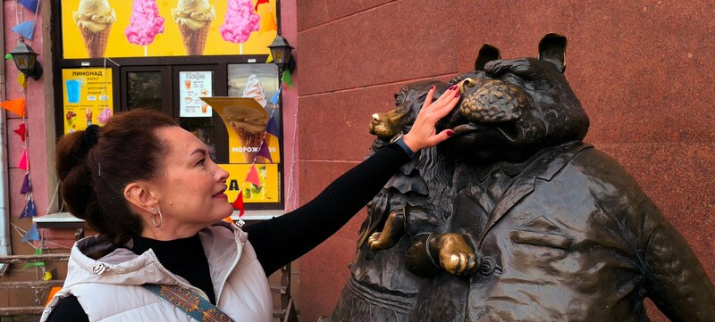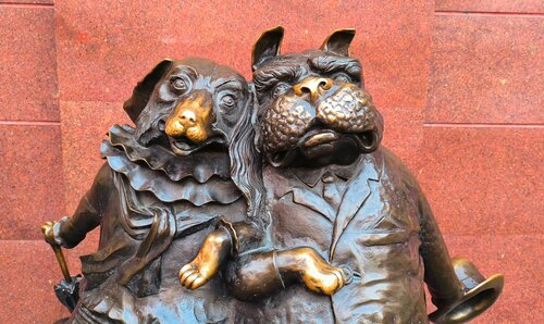 Милейшая скульптура пары собачек.😁 Появилась она, благодаря великому поэту Владимиру Маяковскому, который любил Краснодар и часто в нём бывал. Его всегда впечатляло многочисленное наличие декоративных собак у местных жителей, которые прогуливались с ними по улицам города. Маяковский отразил этот факт в своём стихотворении "Краснодар" словами "это же не собачья глушь, а собачкина столица". Скульптура носит название "Влюбленные собачки". Их носики и лапки натёрты до блеска жителями и гостями города для исполнения своих желаний.😁