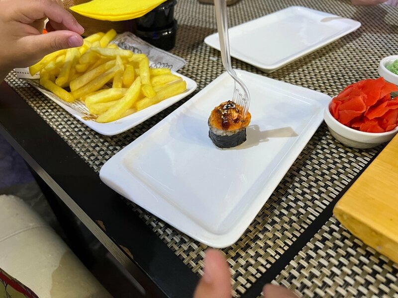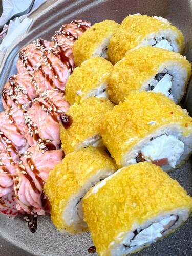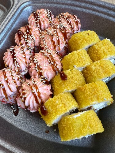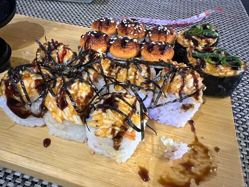 Были проездом в городе 6 сентября и искали, где пообедать. Рядом столовые были закрыты. Зашли в кафе, заказали роллы. Всем понравились. Необычные, такие мы еще не пробрвали. Очень вкусные. Мы были одни , поэтому решили остаться. Подача красивая. Сфоткала как есть ( не фуд блогер)) ). Спасибо вам ребята.