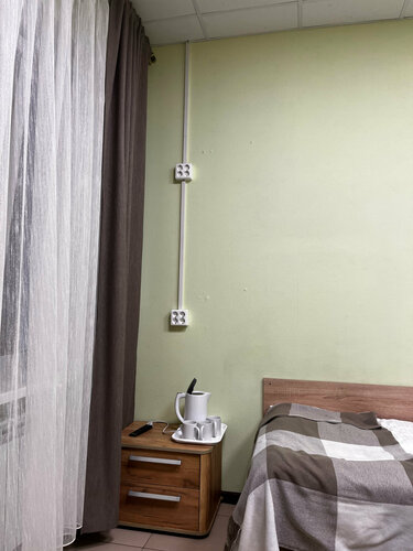 За отзывы дают в подарок пряник. Я не брала. Этим в принципе можно ограничиться. Это дешевая гостиница с самой дешевой туалетной бумагой в туалете. Жуткий цвет стен, на полу ледяная плитка, местами отбитая, но зато много розеток. Это какой-то прикол видимо. Но чисто, на одну ночь остановиться можно. Конечно, тапочки стоит захватить с собой.