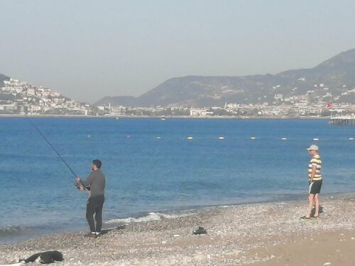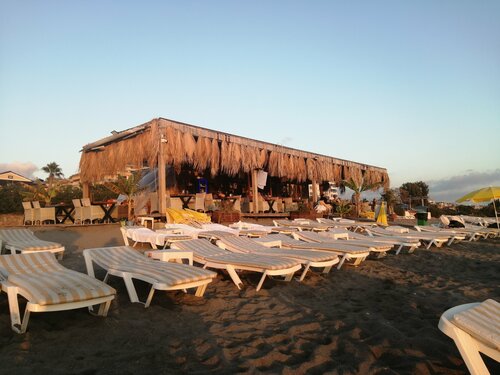 Отличный пляж! Порт далеко! Нет никаких катаний! Песок и галька. Плит нет. Есть кафе с туалетом, душем и кабинками для передевания.