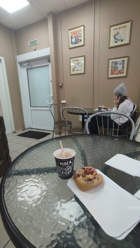 Случайно попал в это заведение ( был проездом) , так как изначально шёл в столовую рядом, но увидел пышки на витрине, Были сомнения зайти или нет, так как хотелось посидеть, а не на вынос или стоя (стойка напротив окна), но подождал когда освободится столик. Приветливый кассир подсказала по ассортименту и примерному весу. Пышки держат небольшое количество готовых и уже фаршируют под заказ, отчего заказ делается быстро. Взял изначально со сгущёнкой и брусникой к капучино, а потом захотел добавки банан и смородина. Цены приемлемые. Туалета нет, но подсказали что в бизнес центре на 2 этаже