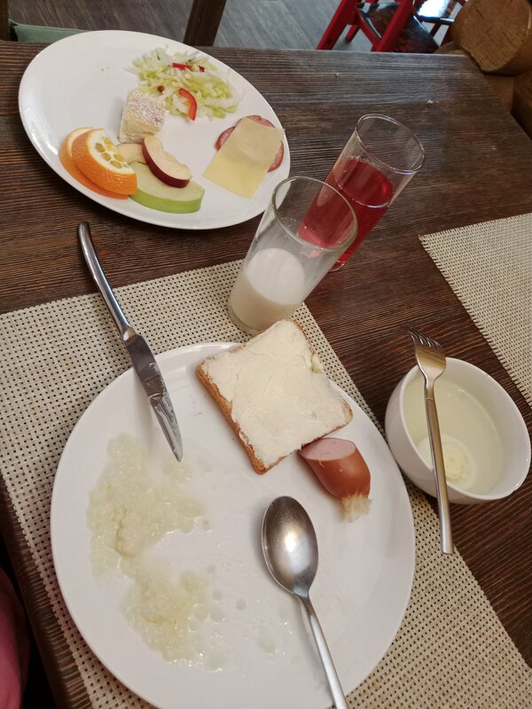 Хорошая гостиница в центре города, не понимаю почему нет звёзд, потому что уровень очень достойный. В номере есть мыльные принадлежности, чайник, телевизор. Завтрак- шведский стол: каша, горячая с гарниром, омлет, сыр, колбаса, варёные яйца, вкусняшки чаю, чай, кофе, молоко, фрукты в нарезке. На этаже кулеры с водой.