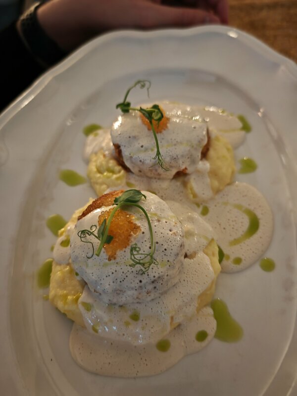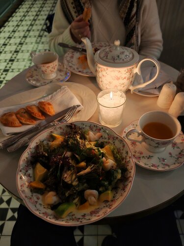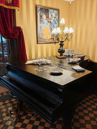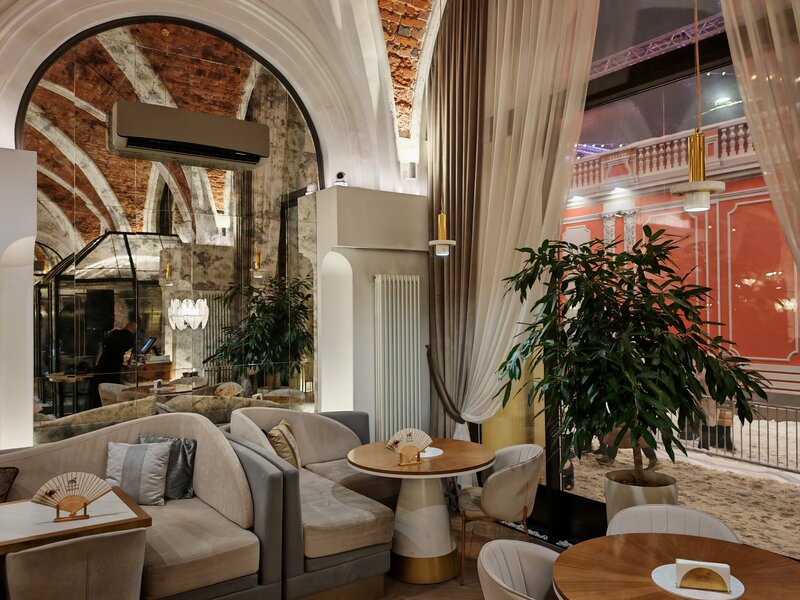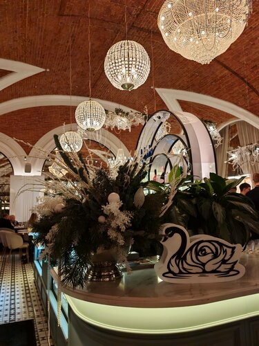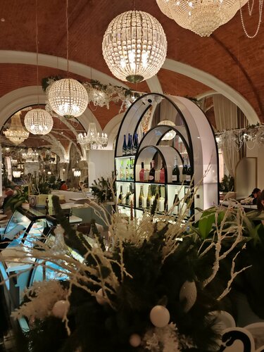 Замечательнее место! Большой зал, два типа столиков - одни с диванчиками по периметру зала, в том числе у больших красивых окон, эти столики надо бронировать заранее, а ещё есть небольшие круглые столики на двоих вокруг барной стойки, вот здесь может оказаться свободное место, как в нашем случае, мы зашли сюда воскресным праздничным вечером и оказался свободный столик. Обслуживание очень дружелюбное, обстановка для кафе какая-то, я бы сказал, немного торжественная. Видно, что посетители бронируют столики для своих торжеств, приходят в вечерних нарядах, с букетами. Находиться здесь ну оочень приятно!) еда вкусная, ожидание основного блюда до 20 минут, обычное. Ценник высокий, но не заоблачный. Воскресным вечером была ещё и живая музыка: девушка пела новогодние хиты, а молодой музыкант подыгрывал на саксофоне, и это было красиво, и громко ровно в меру, чтобы не забивать звуком атмосферу отдыха)
