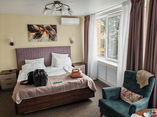 Давненько не пользовались гостиницами с 2-мя звездами, были опасения) и входная группа в отеле, зона ресепшн тоже насторожила, так здесь все, я бы сказал, незатейливо выглядело, как на машине времени на 30 лет назад) но дальше все оказалось замечательно!) заказывали 2 номера - джуниор-сьют и одноместный комфорт. И надо сказать, на сам деле отель приятно удивил: номера очень комфортные, и оснащены всем, что можно придумать, есть тапки, халаты, одноразовые зубные щетки, швейный набор и все такое!) возможно, ремонт был не так давно, потому что все в отличном состоянии, в номере очень тихо, тепло, есть запасные одеяла и подушки. В номере сьют - просто огромный телевизор!) чайник, чай, сахар, кулер на этаже. В номере несколько видов освещения, что очень важно: люстра, прикроватный свет и даже автономная лампа, если хочешь подольше почитать в кресле, никому не мешая! Есть кафе-столовая на первом этаже, если надо перекусить, то вполне домашняя кухня, не дорого, к вашим услугам) перед отелем спокойно можно поставить машину, если путешествуете на машине, обслуживание на ресепшн очень дружелюбное. Как итог, от прежней жизни здесь осталось только название, но содержание и сервис - вполне современные) и это хорошо!) Отелю - спасибо!