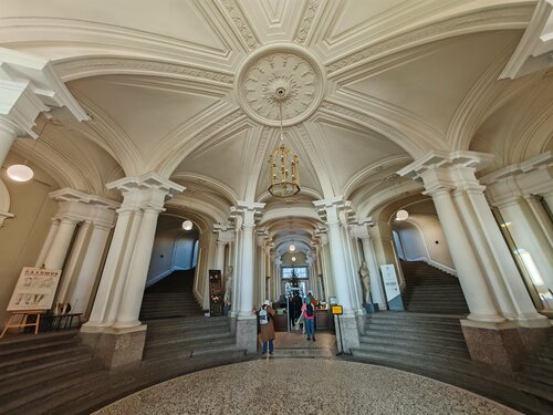 Очень душевное питерское место! И само здание впечатляющей архитектуры: его кольцевые галереи, холл, львы, выставочные залы, и экспозиция - все впечатляет) здесь не бывает толп туристов, всегда тихо и свободно, даже билеты на посещение в новогодние праздники не обязательно покупать заранее) три этажа, большая галерея слепков античных скульптур, копий картин зарубежных мастеров, а также этаж с разделом по архитектуре питерских дворцов и сооружений. Всё интересно. И ещё в огромных залах музея организуются прекрасные выставки, как и положено, академического уровня и содержания! В прошлом году нам удалось посетить здесь выставку о Репине, а сейчас проходит выставка классов птиц и зверей, фруктов и цветов. Мы запланировали полдня на этот музей и не пожалели! На третьем этаже есть автомат с перекусом и кофемашина, кресла и столики, можно отдохнуть.