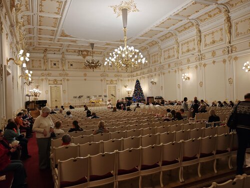 Конечно, в сравнении с Большим залом филармонии, этот - малый) но это очень торжественный, строгий, по-своему величественный зал, с хорошей акустикой. У нас билеты были в 15 ряду партера, оказалось, это почти в конце зала, зал весь -партер) он плоский, без возвышения, для балов)) но на восприятие концерта это не повлияло, слышно все очень хорошо, звуковая картина полная и приятная. слушали Бранденбургские концерты Баха. Впечатления прекрасные!