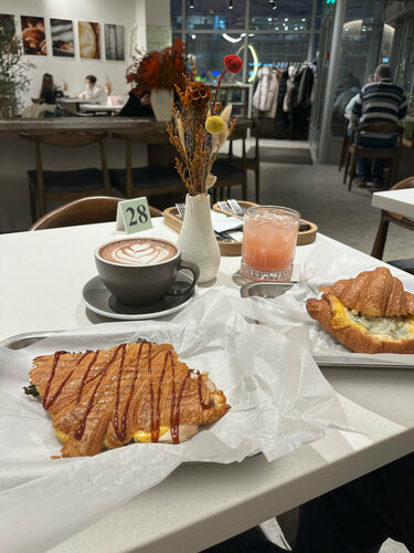 Замечательное место: светлый интерьер, много места. Сотрудники вежливые, могут помочь с выбором позиции. Блюда и напитки — очень вкусные, особенно сладкие круассаны.