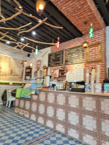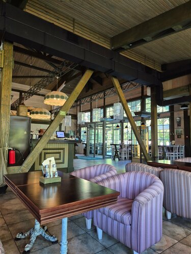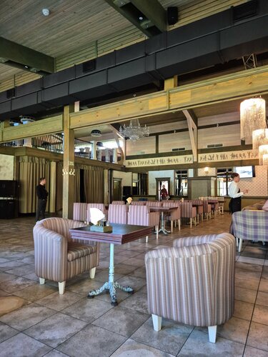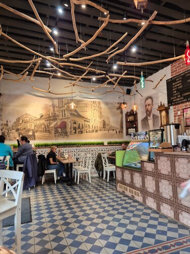 Ресторан с интересными блюдами, десертами. Зал большой, по описанию на 300 мест, высокие потолки, не располагает к спокойному отдыху, столы без скатертей, кресла банальные. Обслуживание вялое, возможно готовятся к активному вечернему пиршеству с живой музыкой. Заказали чай и кофе, десерты, напитки принесли через 20 минут, хотя занято было 3 столика. Про десерты пришлось напомнить через 10 минут, когда кофе уже остыл. За соседним столом аналогично не могли дождаться хлеба. Цена высокая, эклеры по 500 р, в соседнем кафе-пекарне эклеры по 130р. Здание ресторана построено с желанием повторить исторический облик, но мне кажется, что зелёный цвет плохо сочетается со строгим силуэтом строения.