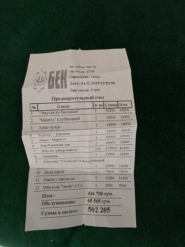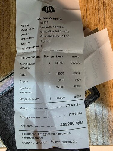 Не оценил - не в центре, а ценник почти как в кофемании. Кофе холодноватый, из еды есть три вида тортиков и все. Какого-то меню или ценников нет нигде, 4 напитка и 4 десерта для не центра Самарканда за 410 тыс (~3200р, я считаю многовато. Вечером ходили в ресторан (их самый раскрученный "Самарканд") - полноценный ужин на 4-х с бутылкой вина за 500тыс. сумм (чек тоже прикладываю). Где эта забегаловка и где нормальный рестик. Меняю первую оценку с 3 на 1, это явно какой-то развод по узбекски :)